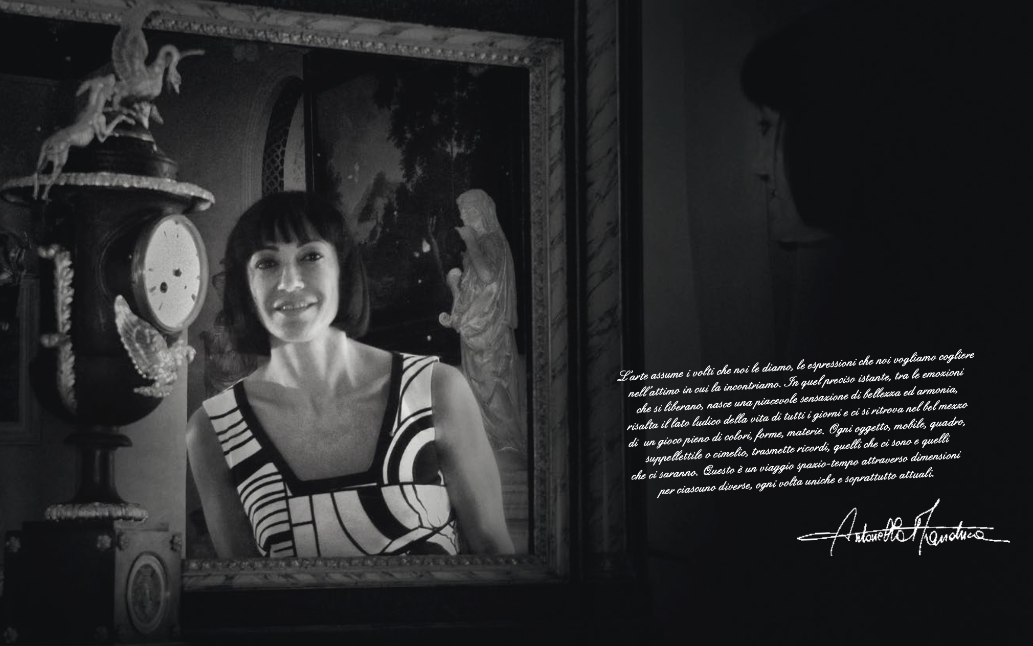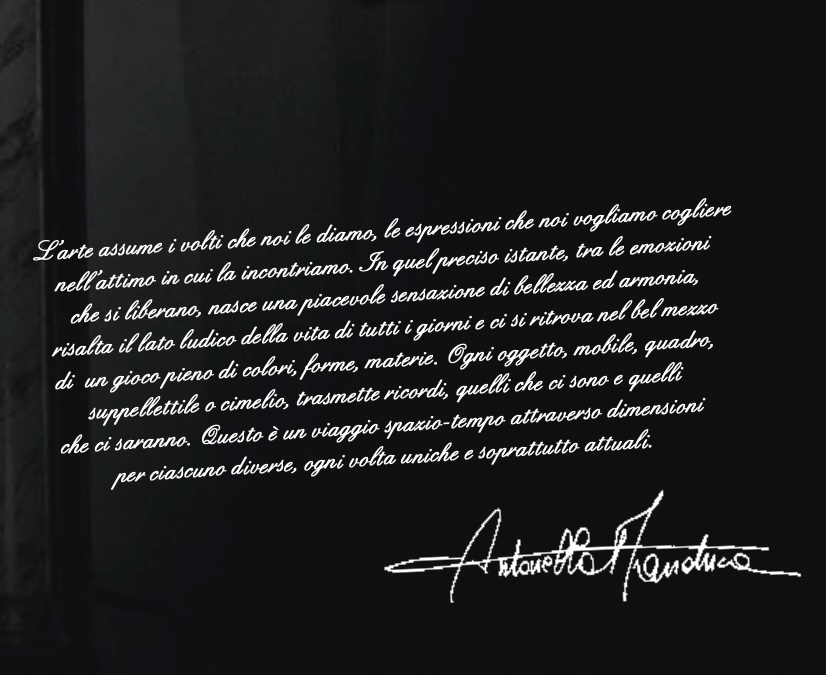 L’arte assume i volti che noi le diamo, le espressioni che noi vogliamo cogliere nell’attimo in cui la incontriamo. In quel preciso istante, tra le emozioni che si liberano, nasce una piacevole sensazione di bellezza ed armonia, risalta il lato ludico della vita di tutti i giorni e ci si ritrova nel bel mezzo di un gioco pieno di colori, forme, materie. Ogni oggetto, mobile, quadro, suppellettile o cimelio, trasmette ricordi, quelli che ci sono e quelli che ci saranno. Questo è un viaggio spazio-tempo attraverso dimensioni per ciascuno diverse, ogni volta uniche e soprattutto attuali.